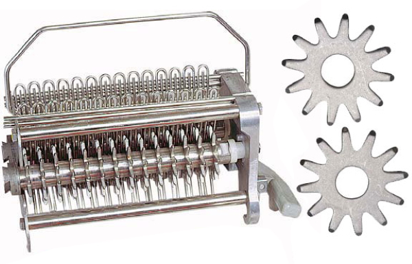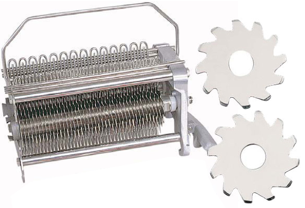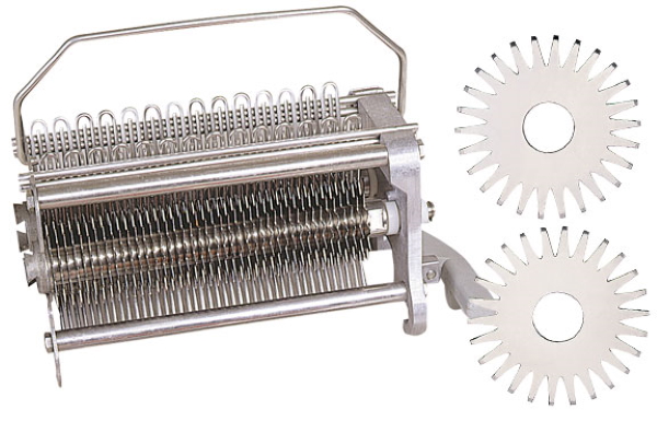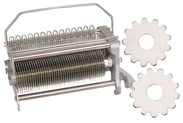 The PRO-9 Series machines are merchandising centers and offer great versatility. Use the Standard Tenderizer Cradle assembly to tenderize and knit beef products. The Strip Cutting assembly for strip cutting of beef and chicken stir-fry products, or for fajitas and julienne for salads, beef jerky strips, and beef cubing for kabobs and stews. The Star Roller assembly can punch 1/8” lasting holes in beef patties to make the beef more tender and reduce cooking time up to 40%.